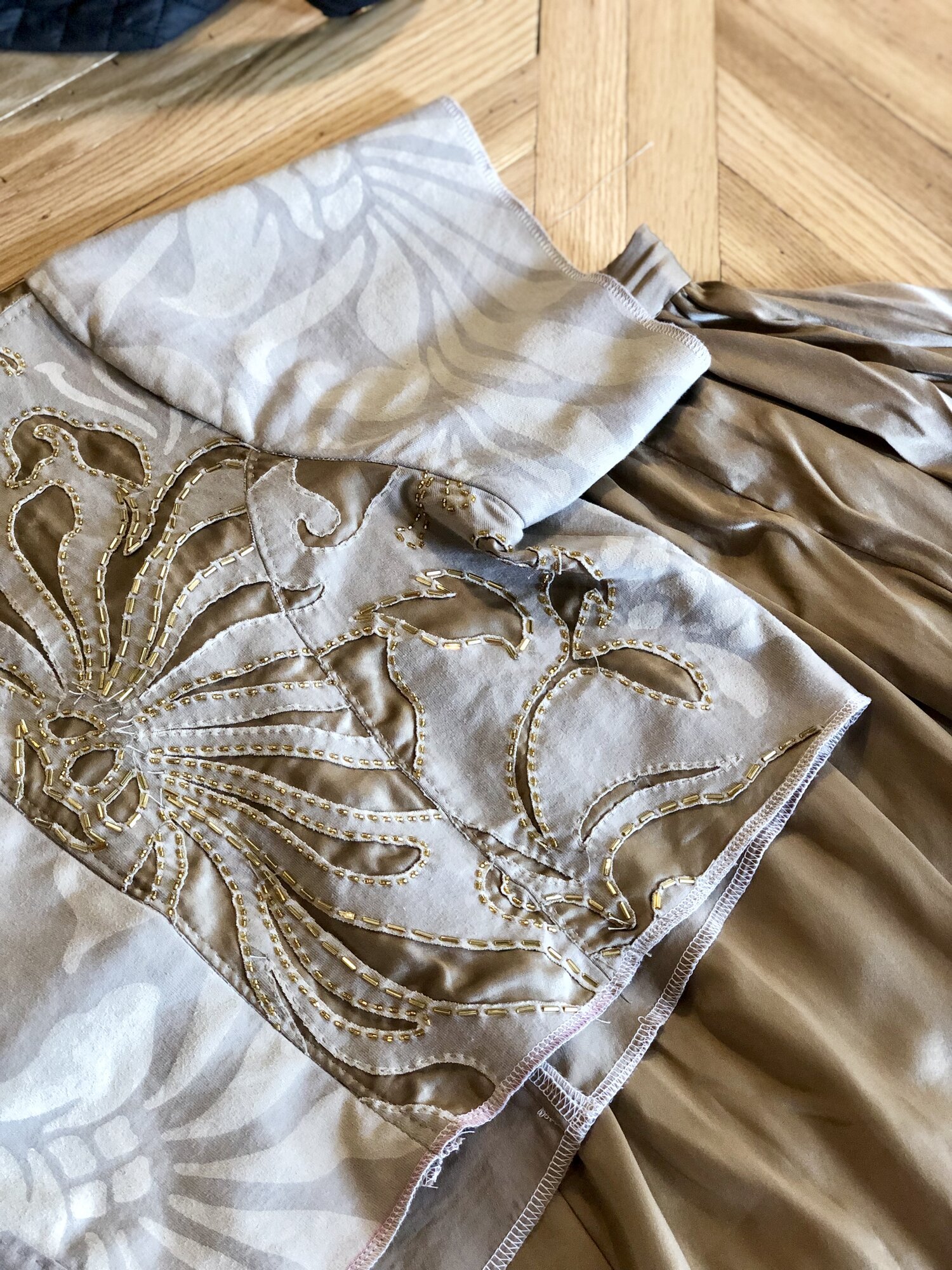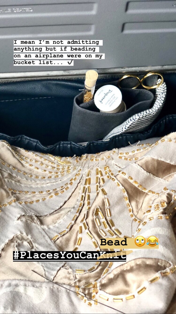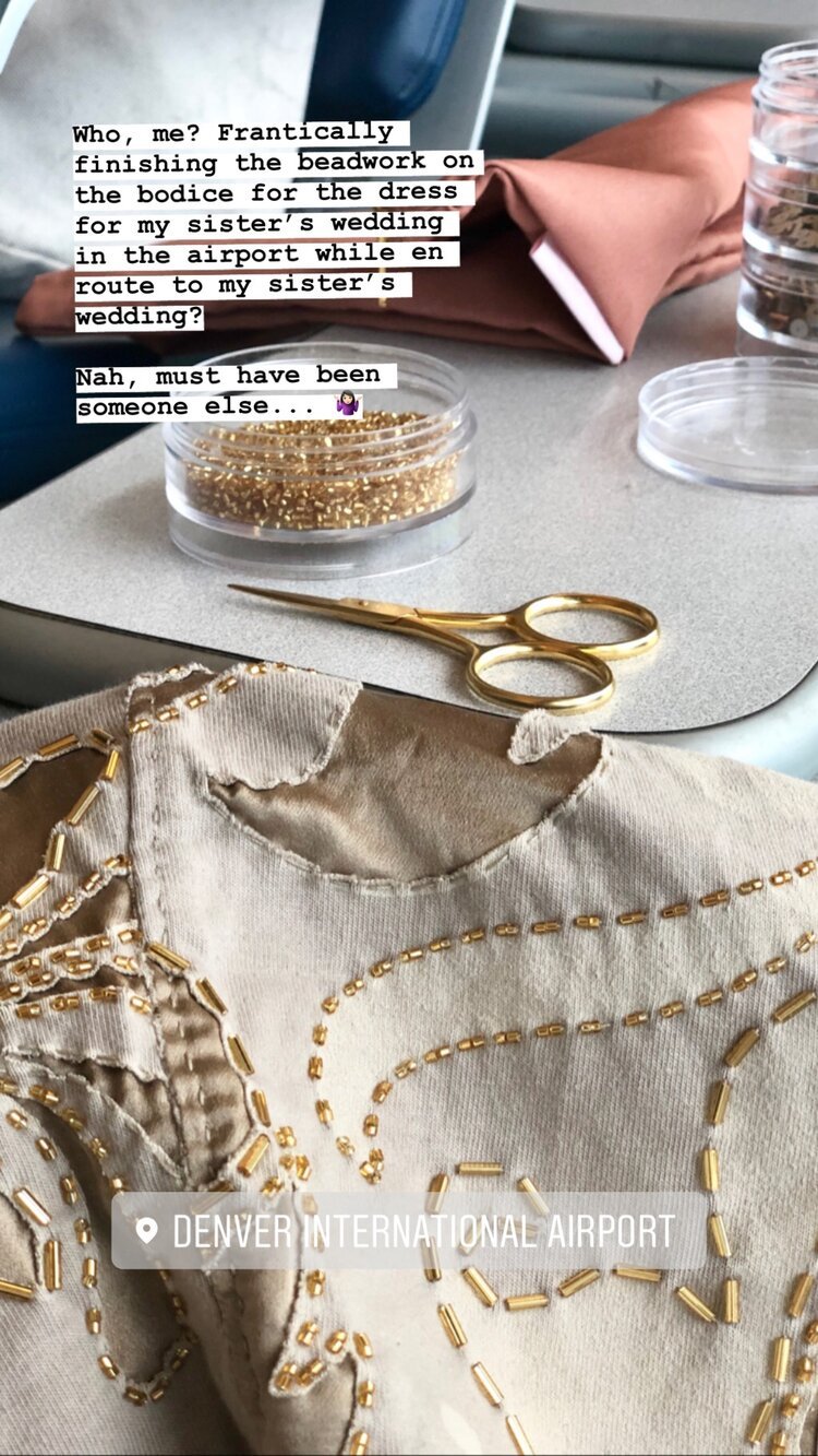 Once all the top was assembled, it was just a matter of time and patience to do the beadwork. I beaded everywhere. I beaded in bars, in coffee shops, outside and inside, at my desk, in bed, and yes, on airplanes. BEADWORK TAKES A LOT OF TIME. I think if I knew how much time it would take, I might not have started it. I may have still been beading the morning of the wedding, while getting my hair done…