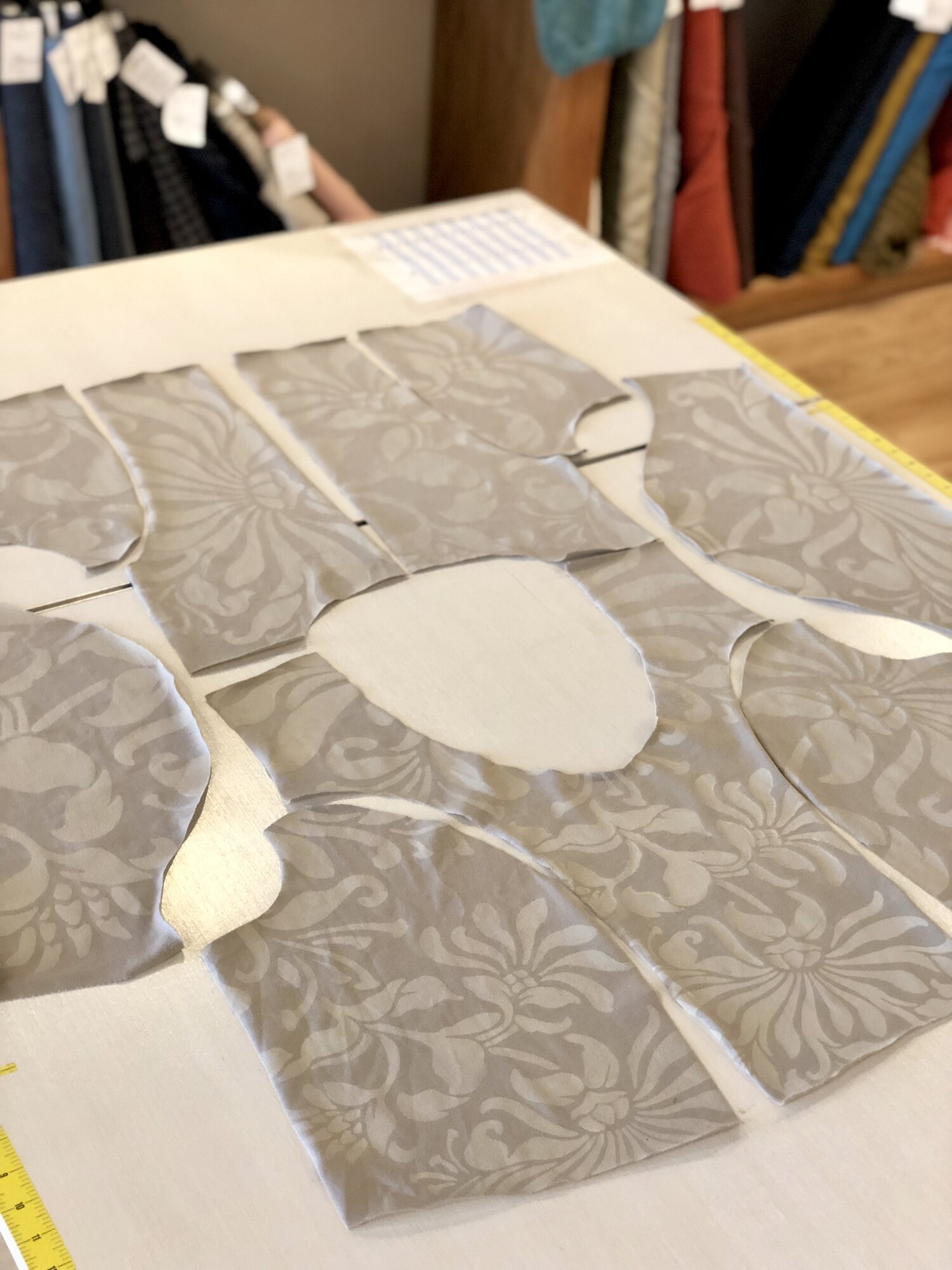 For those unfamiliar with Alabama Chanin, the basic idea is to create motifs by stitching together two pieces of non-stretch cotton jersey — a top layer with a printed/air-brushed design, and a plain bottom layer — and then cutting out pieces from the top layer to expose the bottom layer. It creates beautiful, subtle texture and elegant designs.