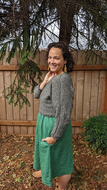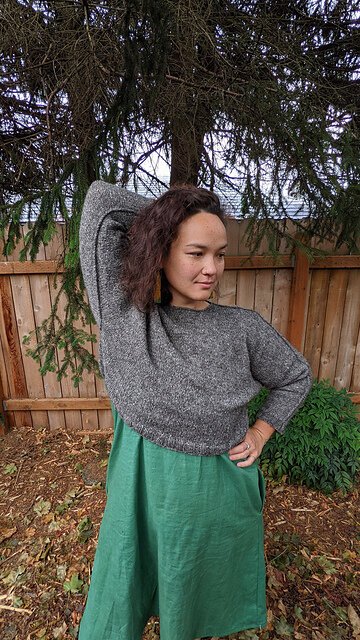 BAY was designed in Magpie Fibers Equinox Worsted (184 yards/168 meters/115g), a 65% silk/35% linen blend. This yarn makes for a luxurious, super soft, all-weather sweater with a lovely sheen and drape.