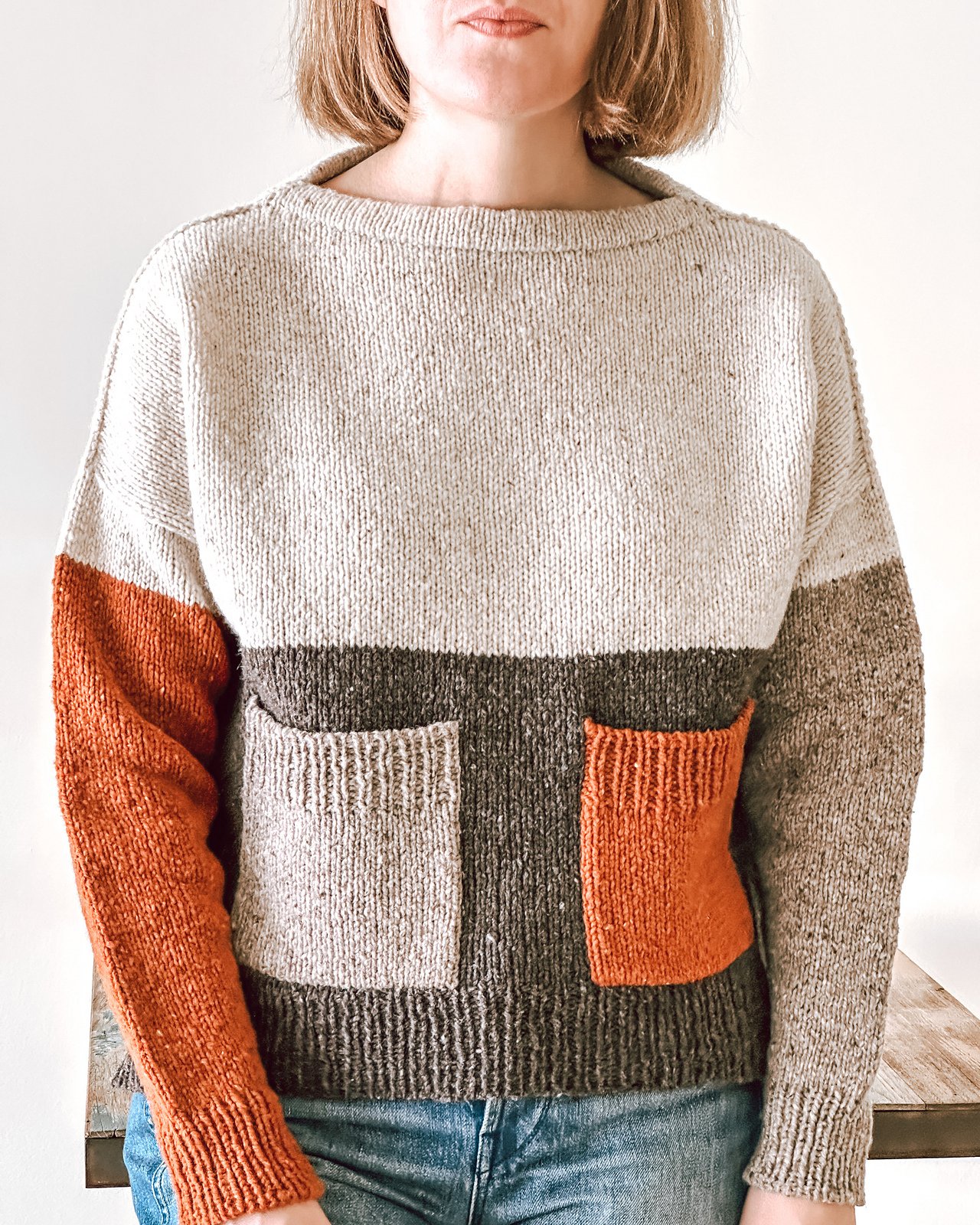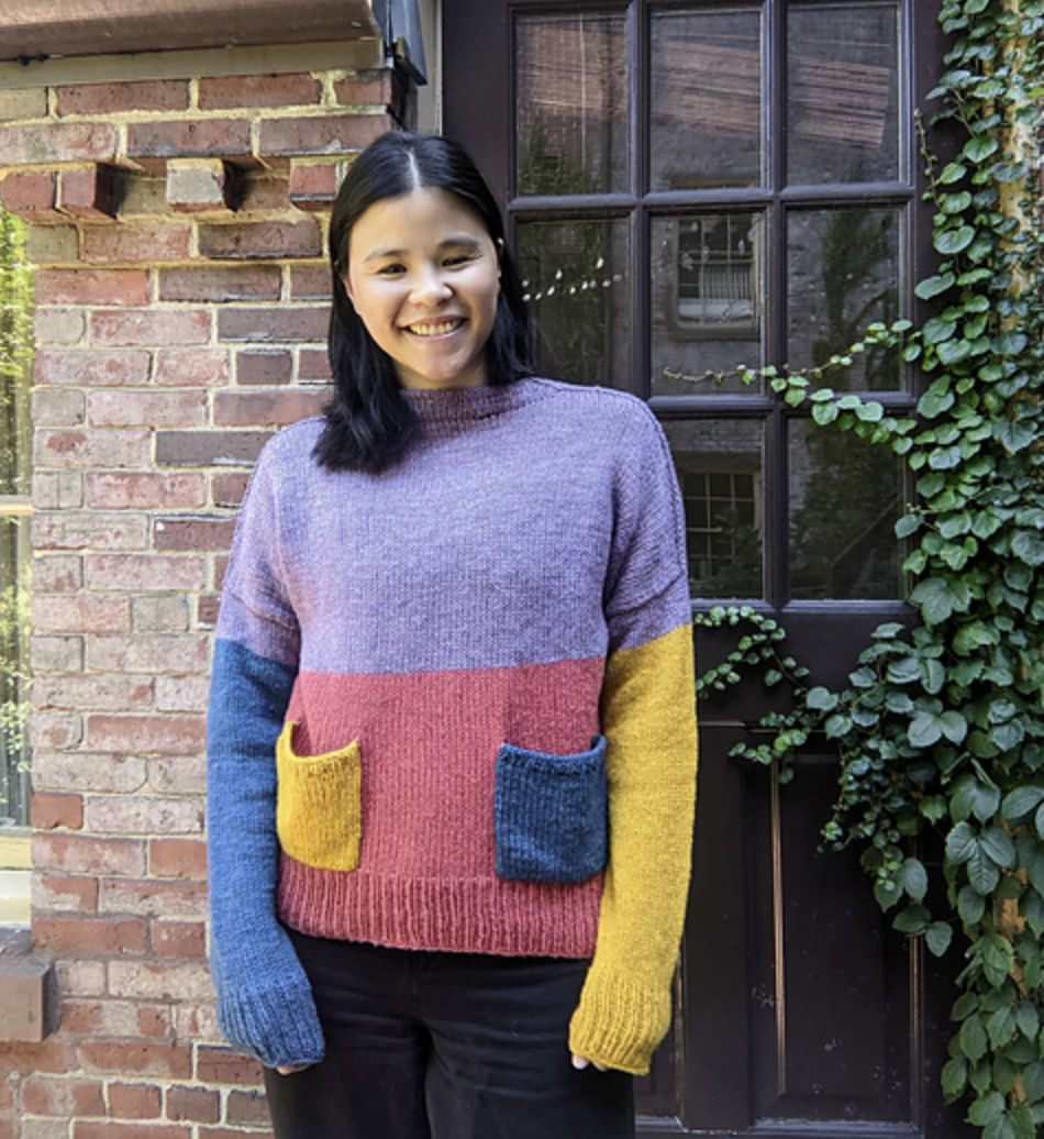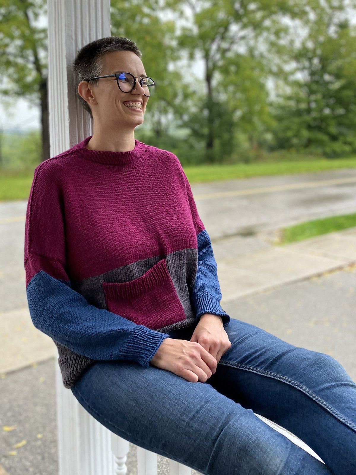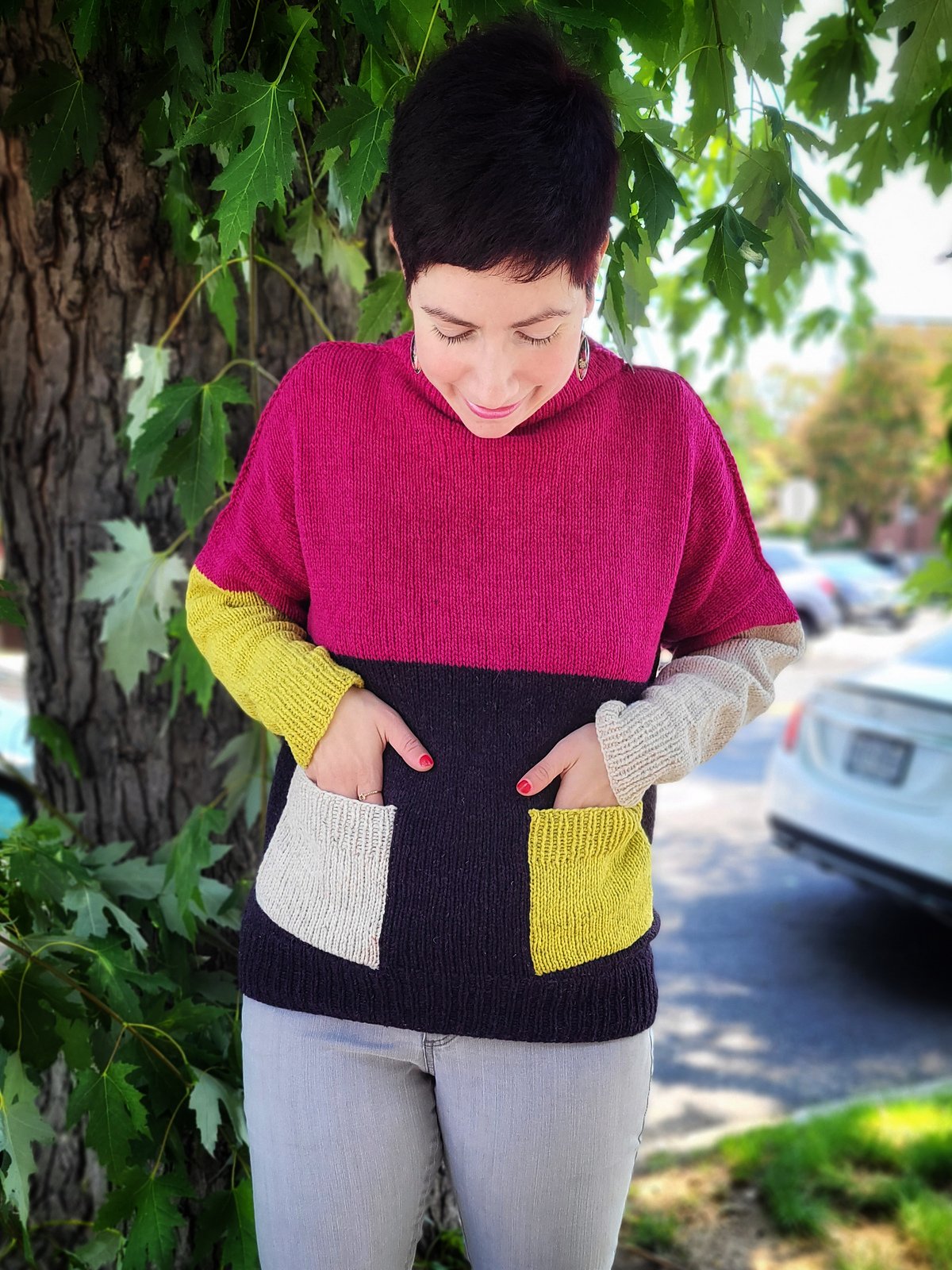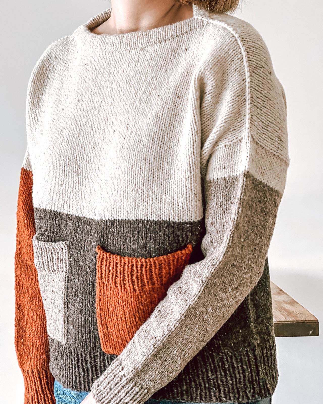 Chroma is a cozy color-blocked pullover with a relaxed fit, a statement piece equally suited for a day of TV on the couch or a picnic on a crisp autumn afternoon. Worked mostly in stockinette, this simple design with clean lines is the perfect blank canvas for playing with color. The pattern features bottom-up drop shoulder construction, a dip high-low hem, increases along the body for a subtle bell shape, a folded hem mock neck, 1 or 2 optional patch pockets, instructions and yarn requirements for 2-4 different colors, and 9 sizes.