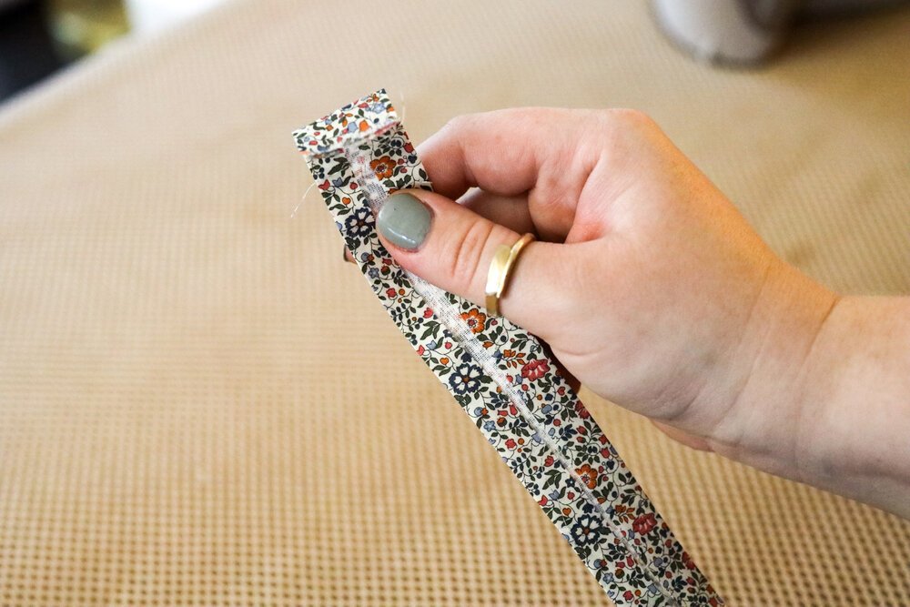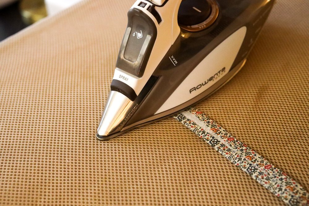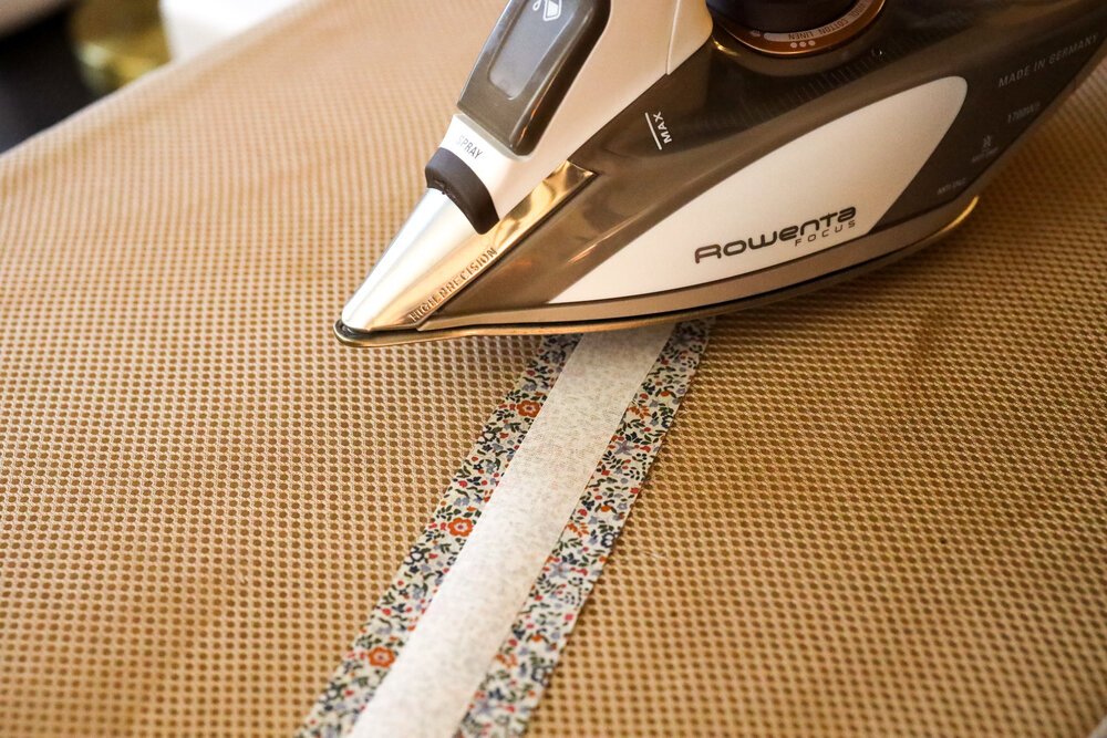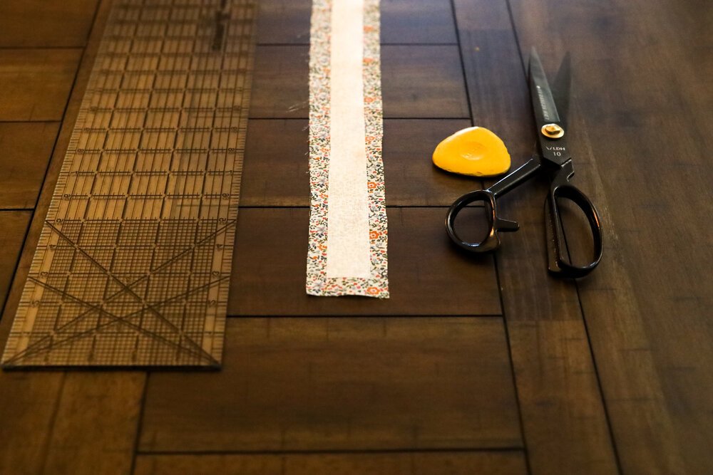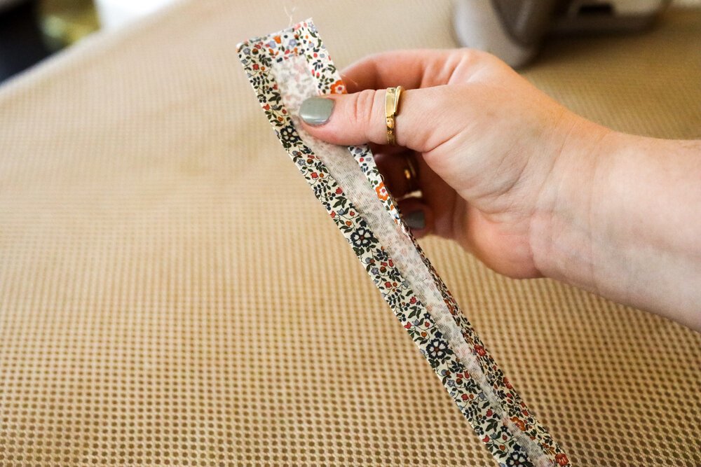 Follow the instructions for your fusible interfacing to fuse one strip to the center of the wrong side of one strip of fabric facing. Fold the long edges of the fabric facing .5”/1.25cm over the fusible interfacing to meet in the middle and iron in place. Fold each of the short edges over .5”/1.25cm to the wrong side and iron in place.