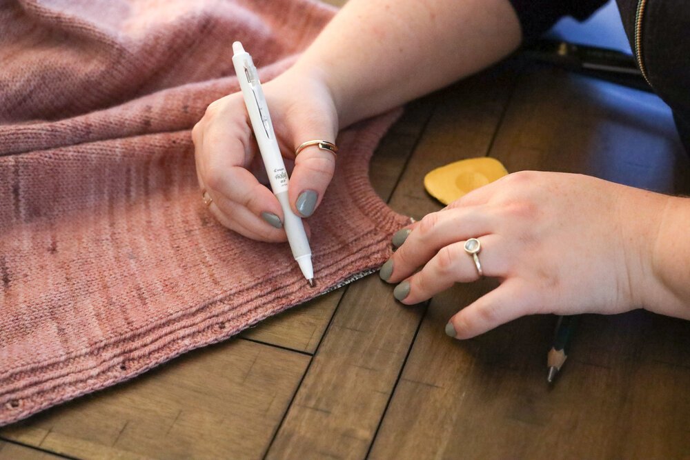 With your cardigan laying open on a flat surface, put one facing carefully underneath the right front button band. Use fabric chalk, a pencil, or an erasable fabric pen to mark each of the buttonholes on your facing.