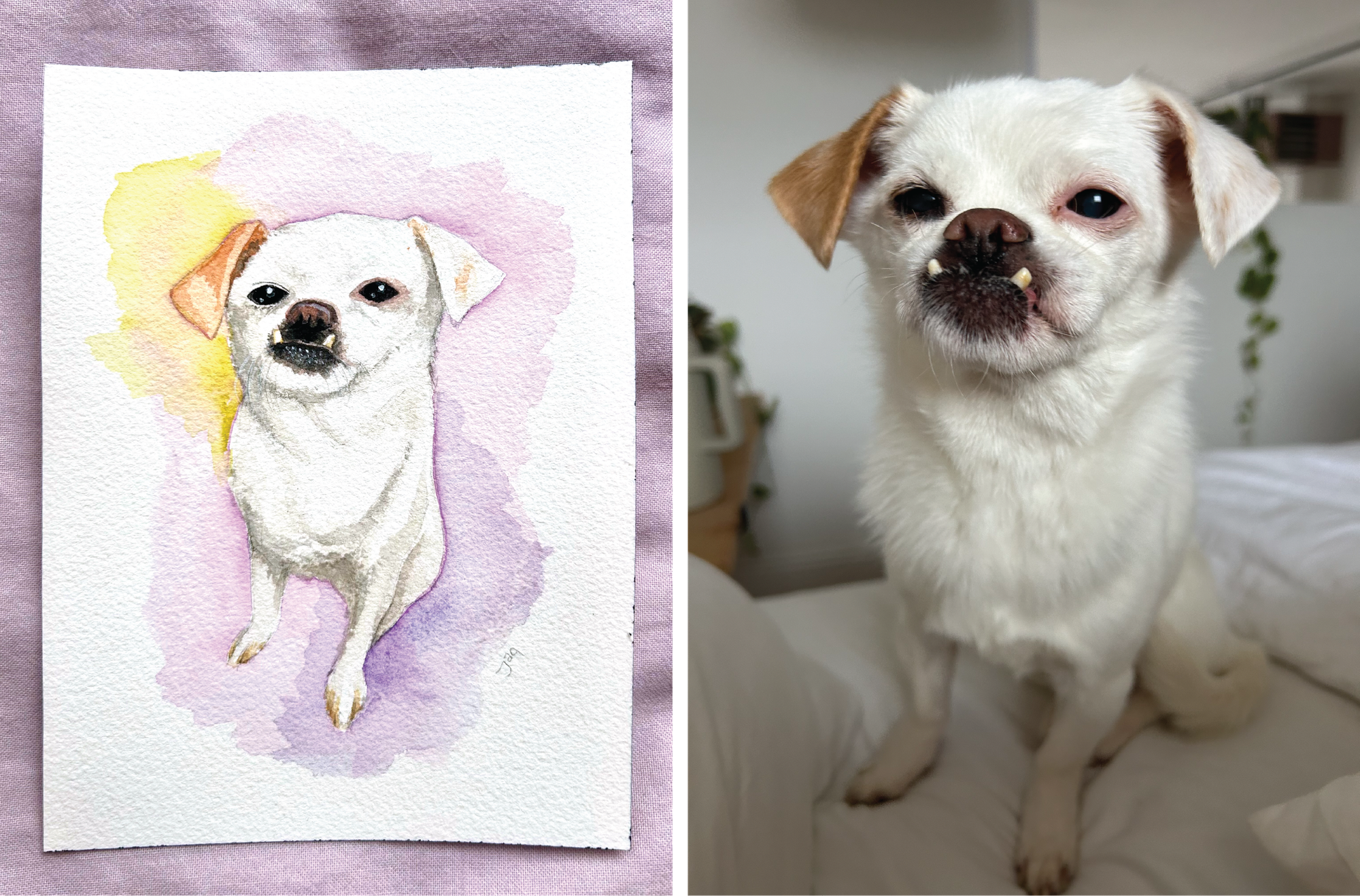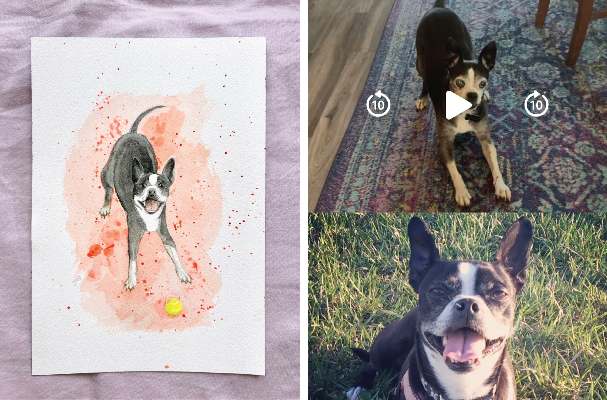 Given all this ~*experience*~ I now have, I've found myself thinking a lot about what goes into an exceptional pet portrait: what are the common denominators in the ones that make me go "wow" and immediately text a photo to a friend when I finish them? Part of it is just the unpredictable nature of handmade art — the stars align, the brush strokes fall just right, the artist (me ◡̈ ) is moved by an unknowable spirit to make literal magic. But also, as it turns out, there are some tangible things that set up the artist (me ◡̈ ) to paint a predictably better pet portrait from the start.