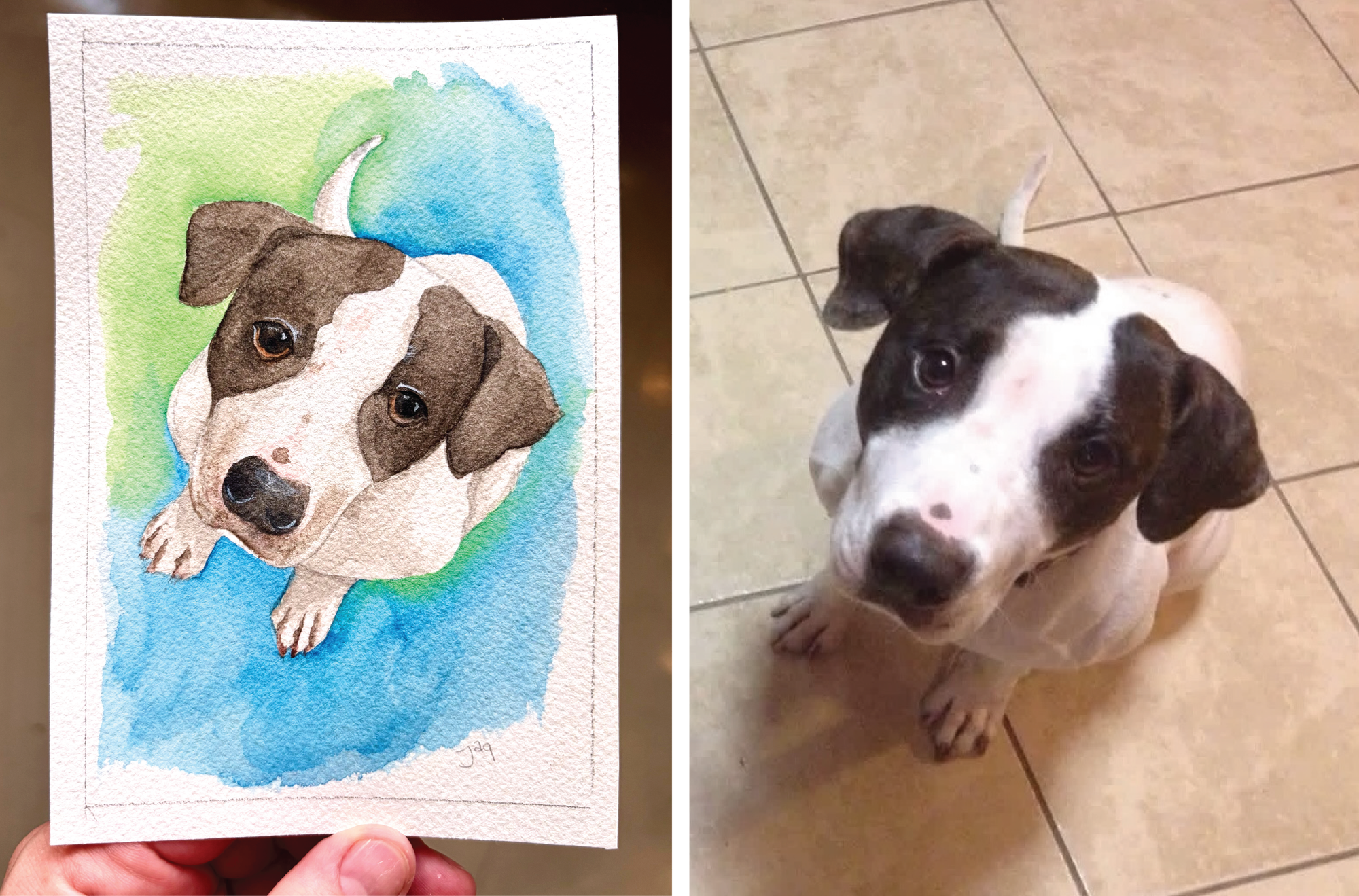 - interesting angles: most people submit photos of their pet's face straight-on from the front, and usually this is great, but every so often I get a profile photo or a photo with the face slightly at an angle, and these often translate beautifully in watercolor, which is a medium with a bit of a quality of movement to it