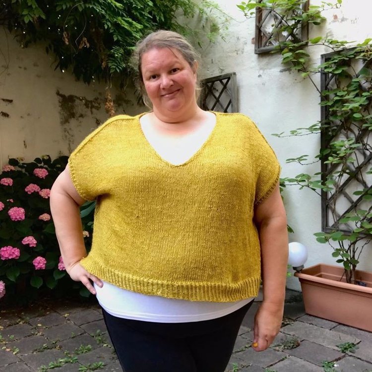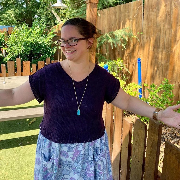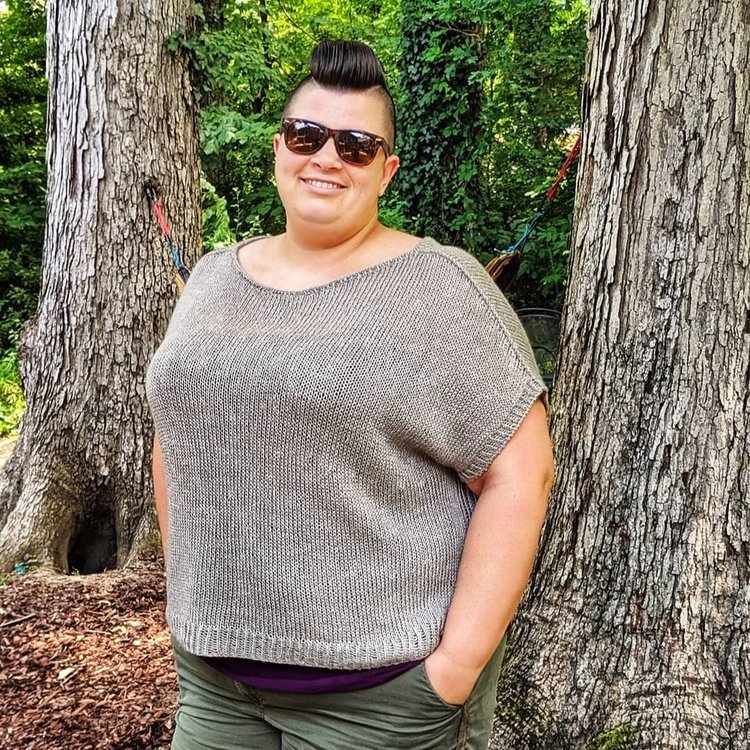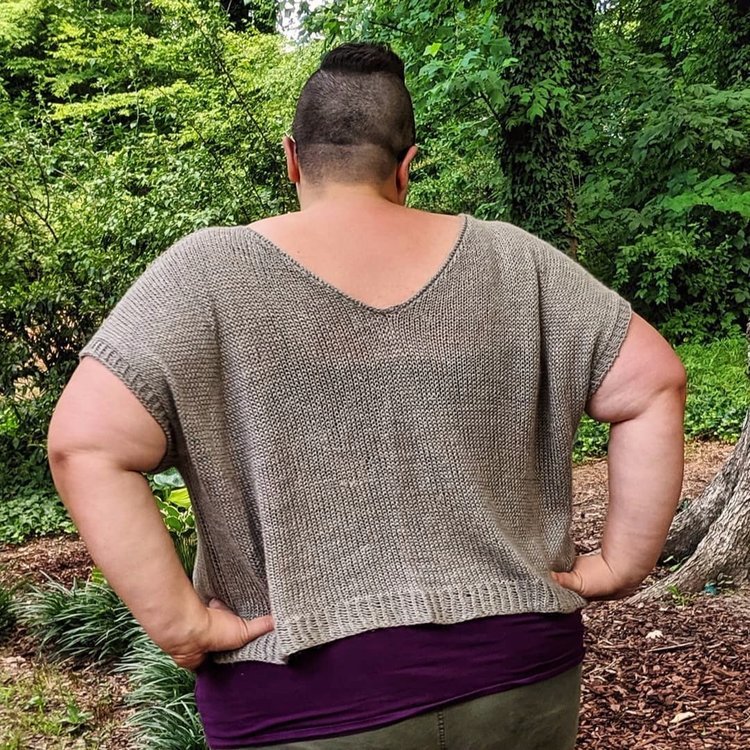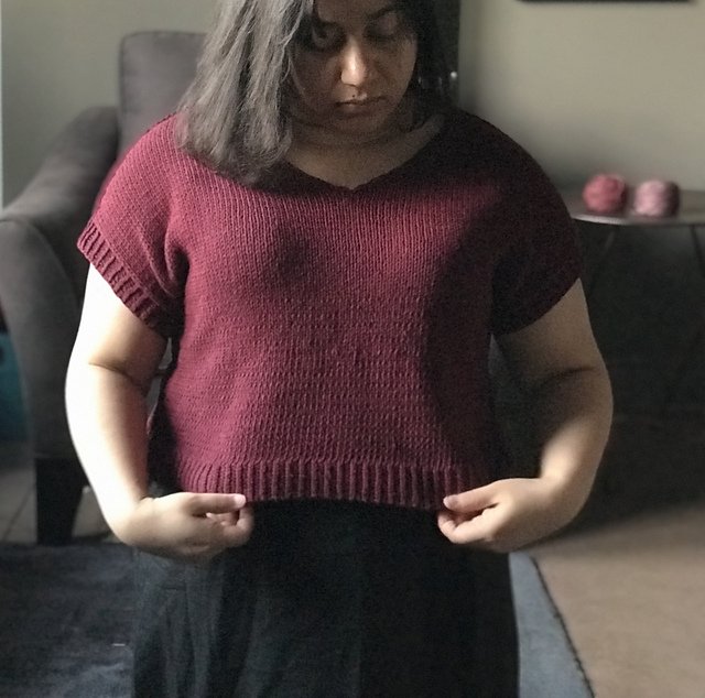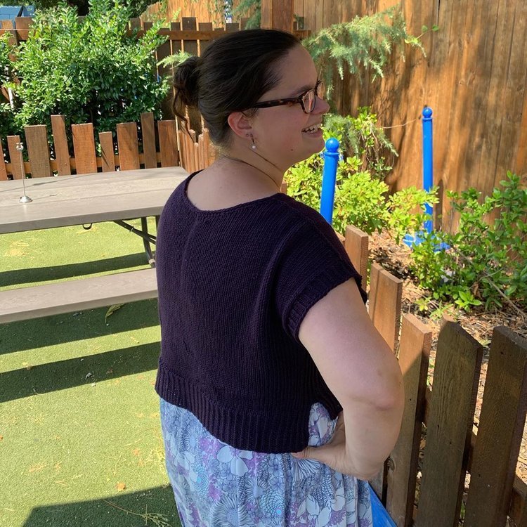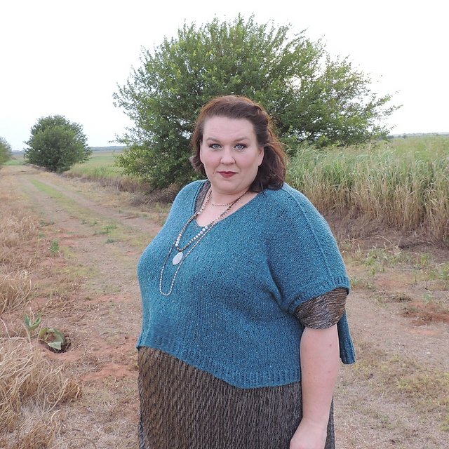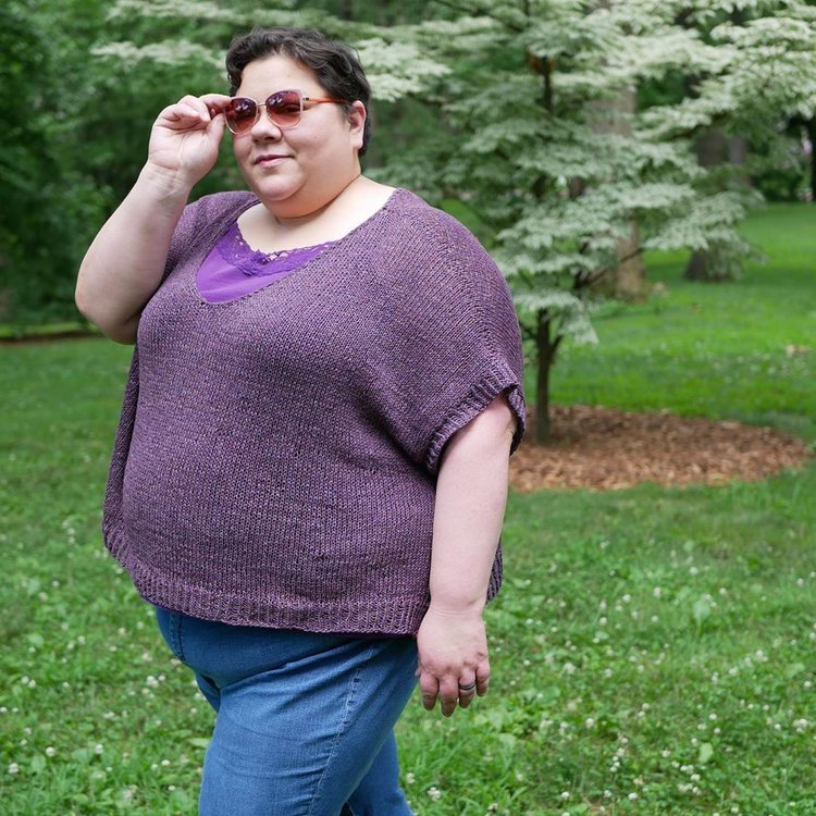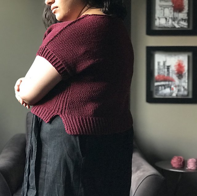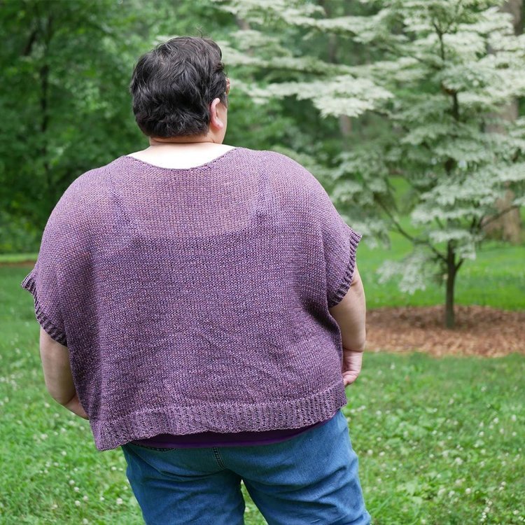 Modifications: lighter weight yarn and smaller needles for a more fitted tee; added 2” to the length