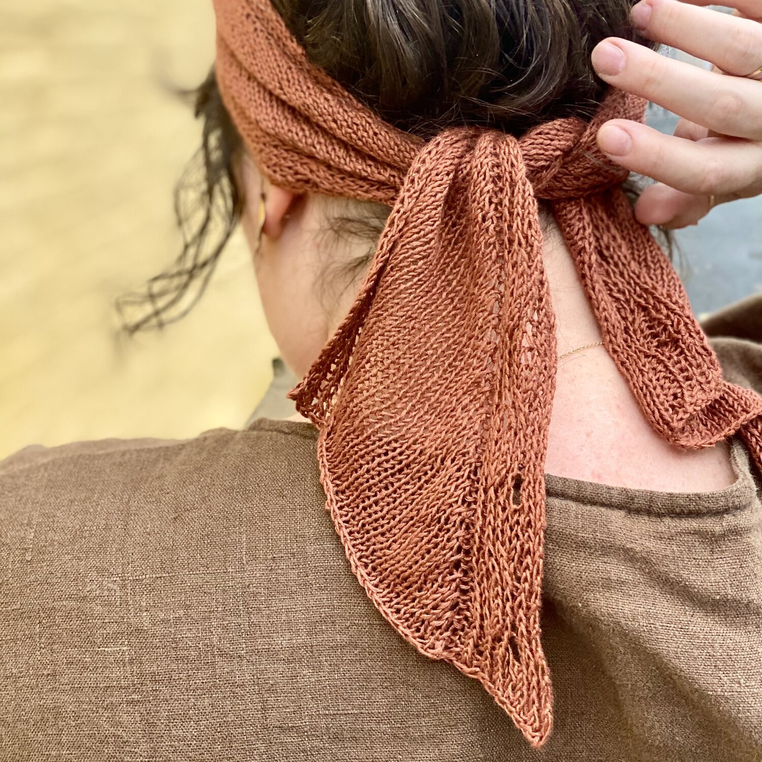 My finished headwrap measures about 43” / 107.5cm long. I used 1 entire ball of Quince & Co. Sparrow (168yd / 155m / 50g), a 100% organic fingering weight linen, in color “Penny.”