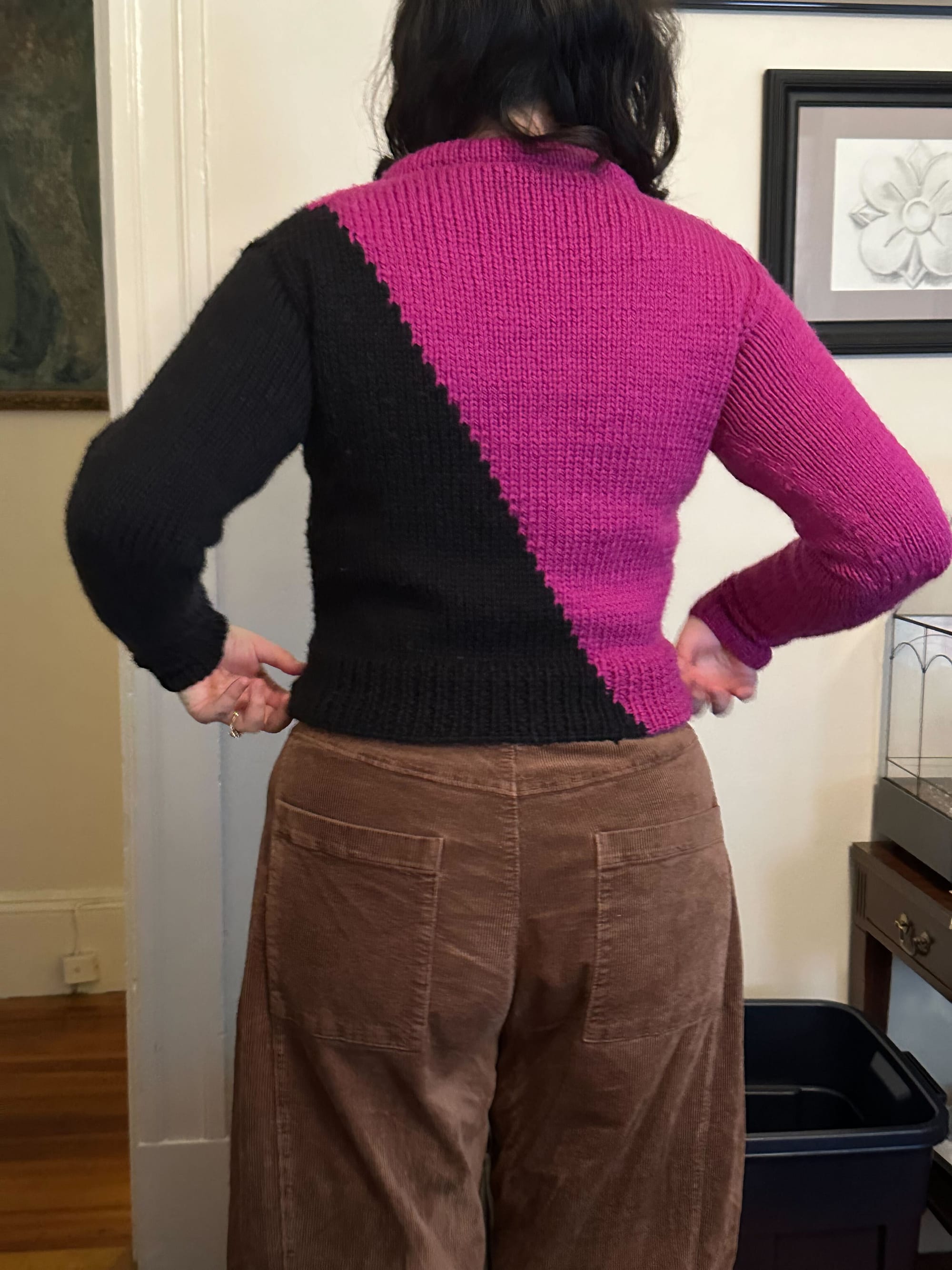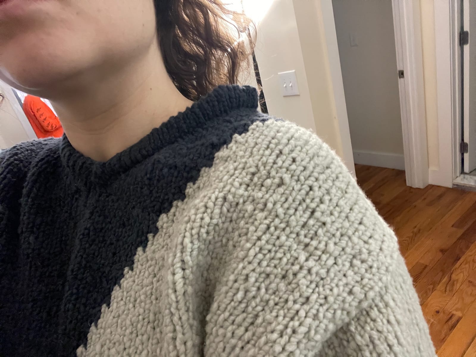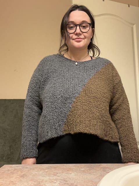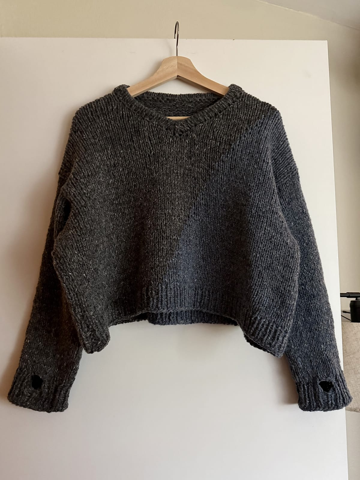 Modifications: "Made sleeves 20in long total, used tubular bind off for sleeves and did not size down for ribbing, body total was 27in for a more cropped fit and sized up to US 10 for body hem bind off for do to tightness."