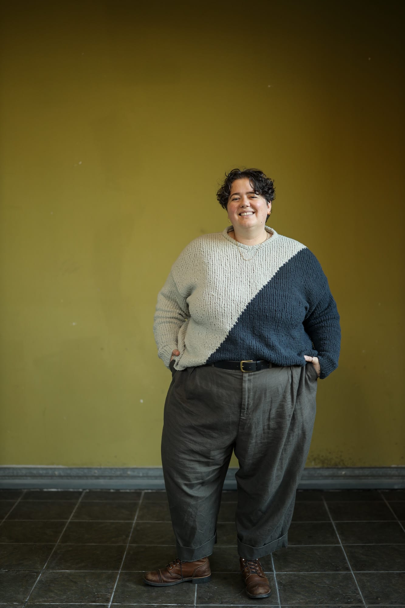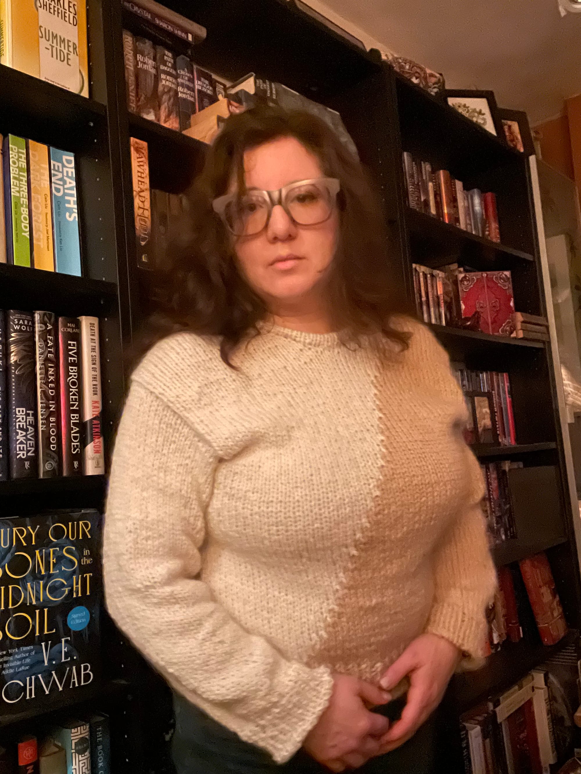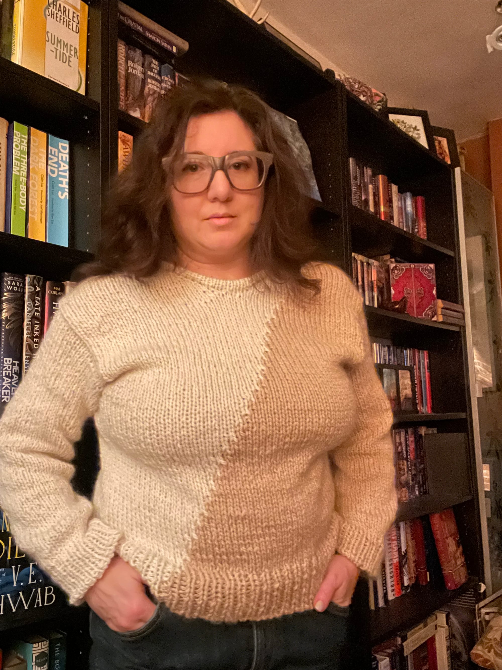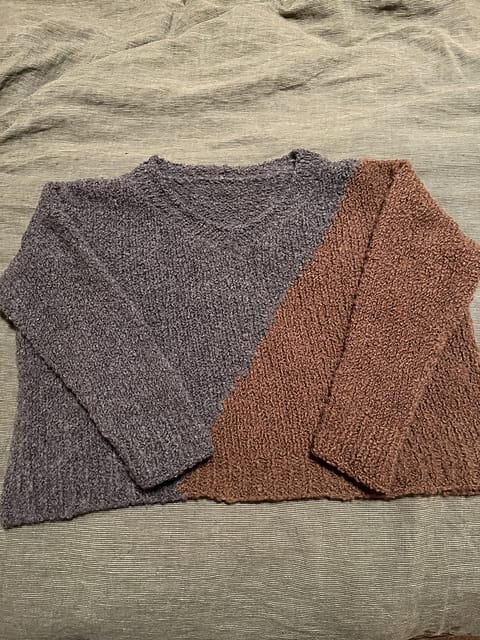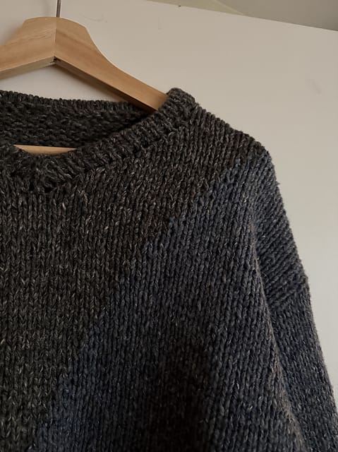 Modifications: "Made sleeves 20in long total, used tubular bind off for sleeves and did not size down for ribbing, body total was 27in for a more cropped fit and sized up to US 10 for body hem bind off for do to tightness."