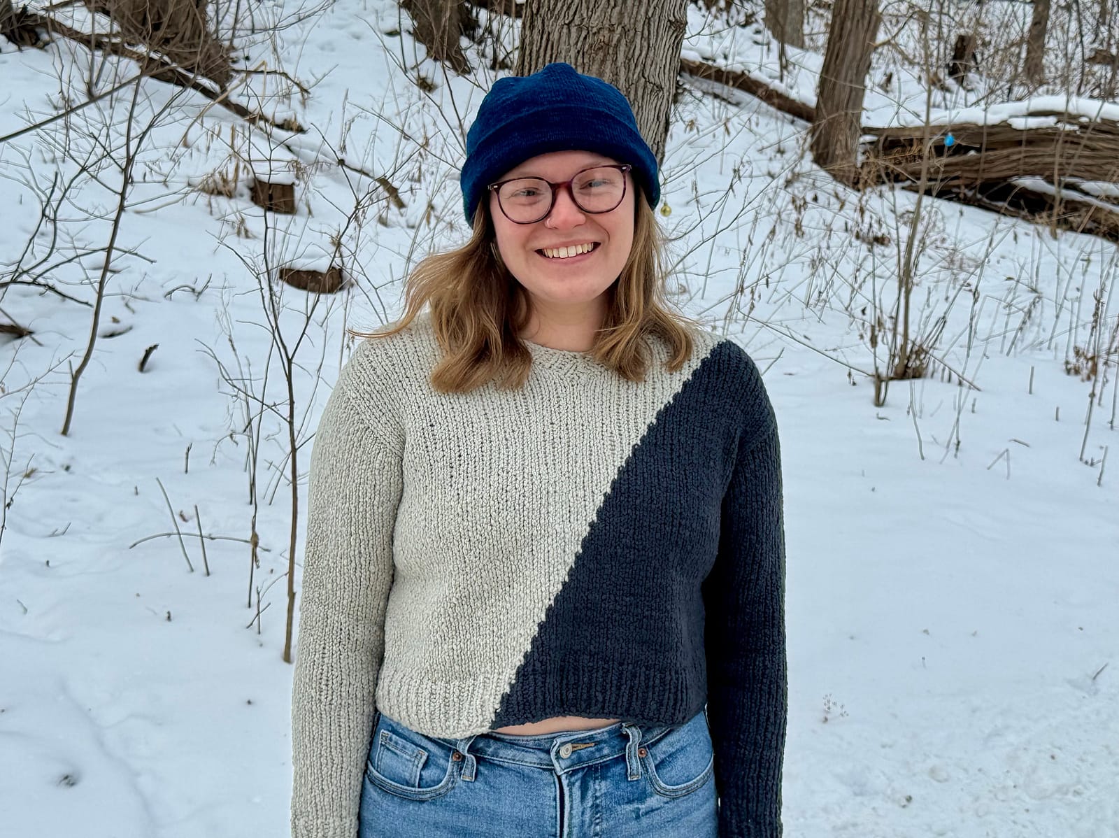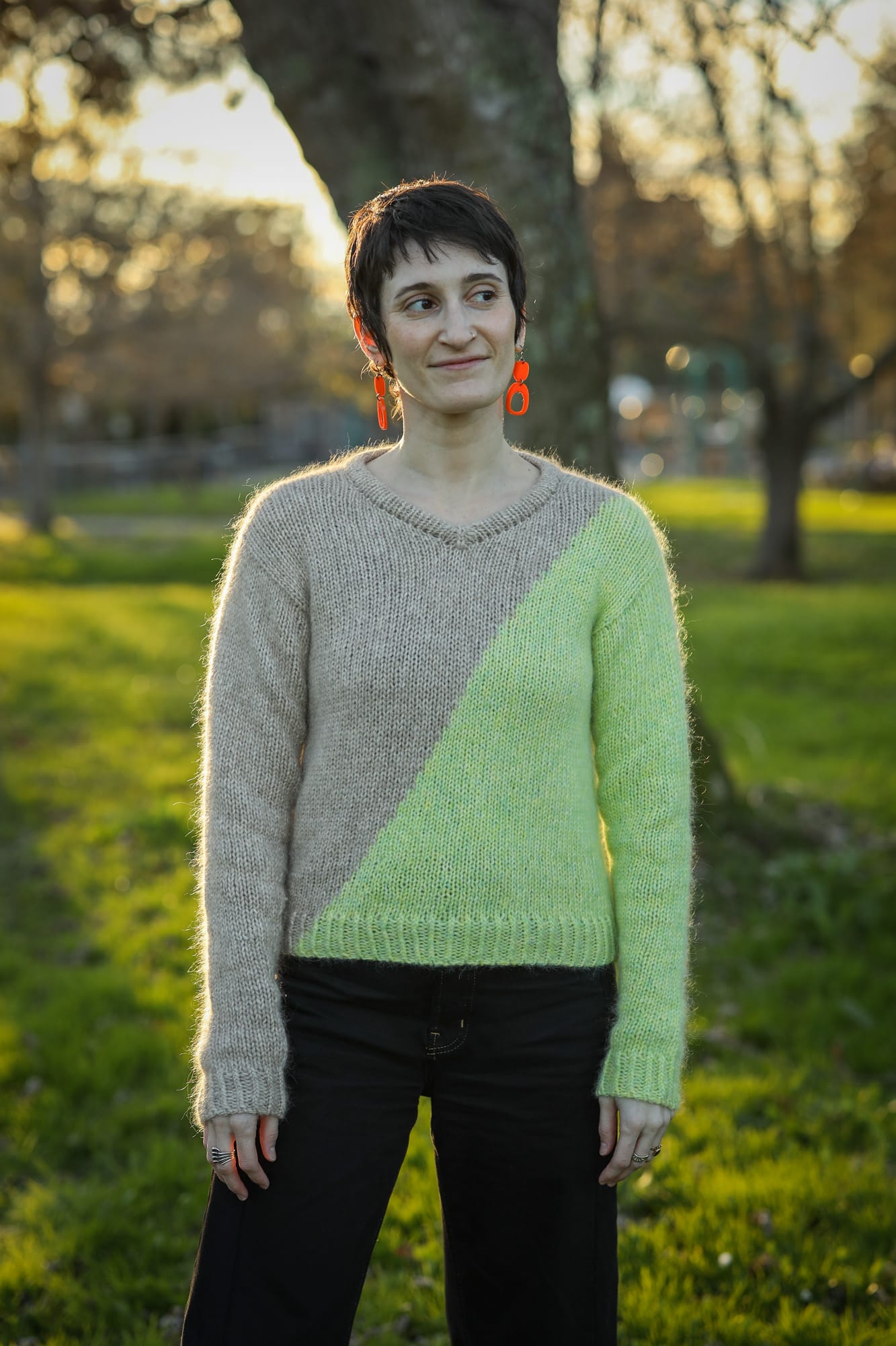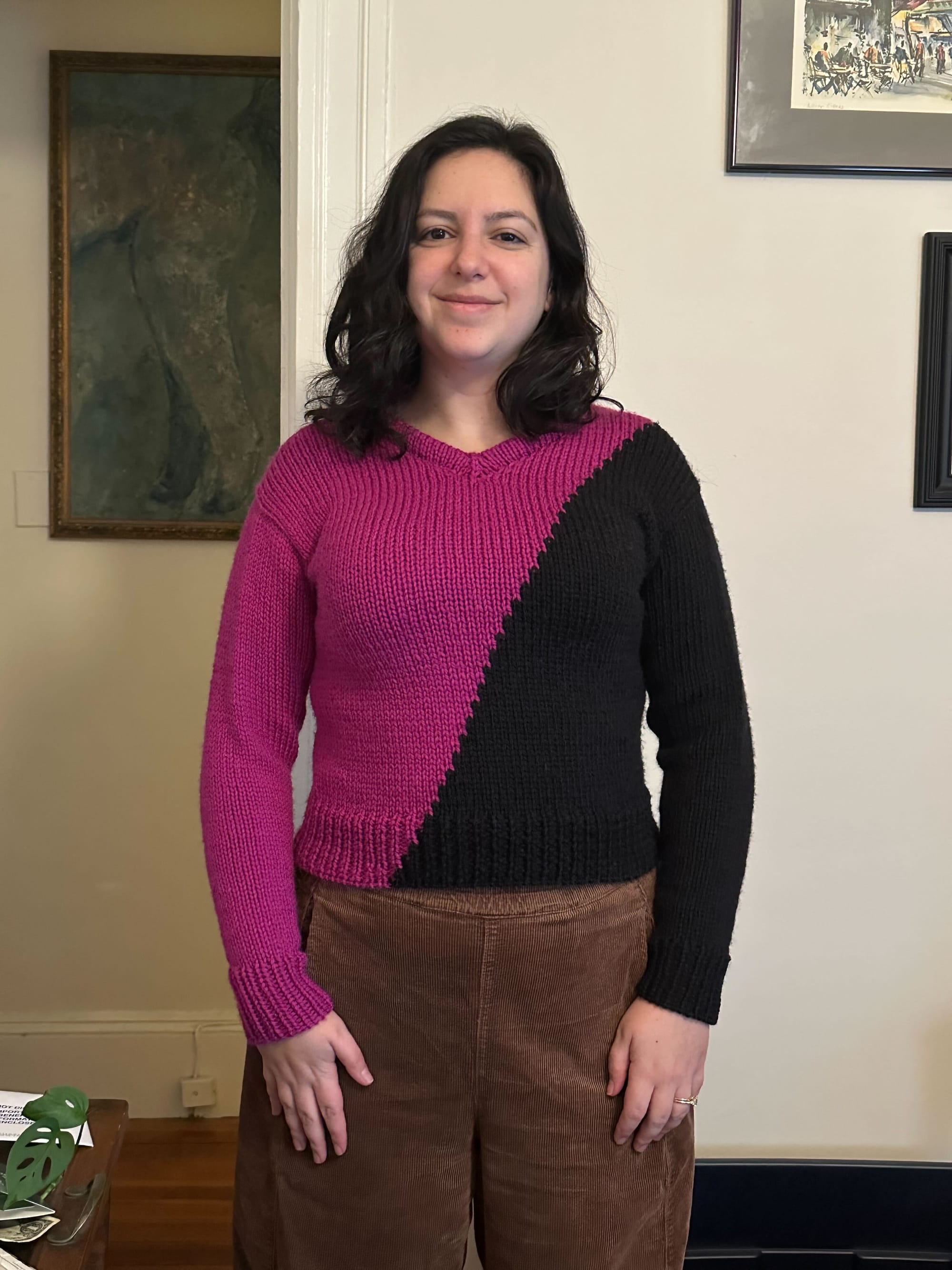 This sweater is a celebration of simplicity — from the top-down European drop shoulder construction to the diagonal color-blocked intarsia across the body, this quick and easy knit makes the coziest wardrobe staple in your favorite bulky weight yarn. The pattern includes instructions for 9 sizes, and both charted and written instructions for the intarsia.