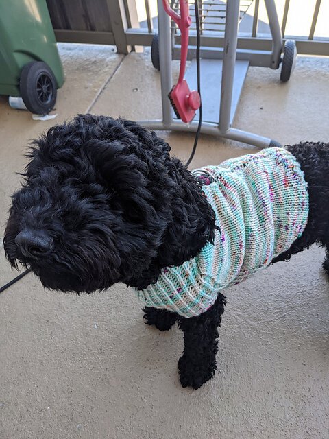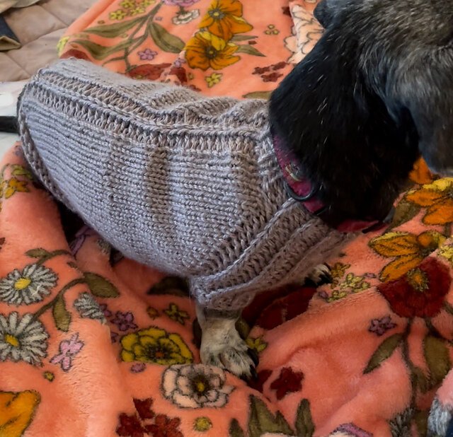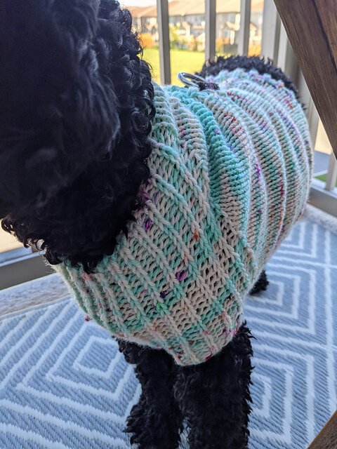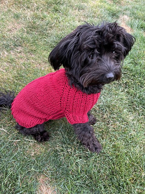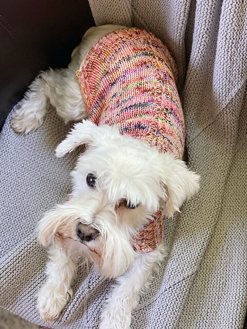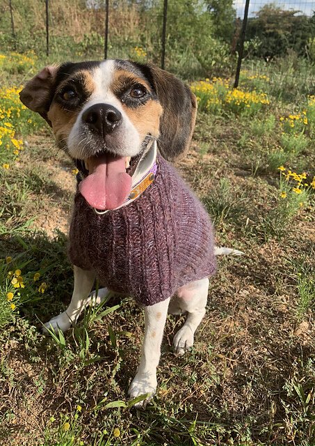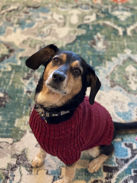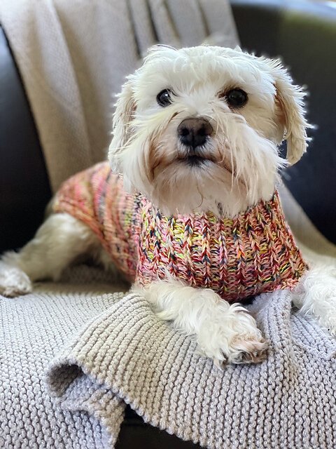 I collaborated with yarn dyer Anne Vally of Little Skein in the Big Wool for this design, who created beautiful custom colorways for both my dog Raii (black miniature schnauzer) and her dog Molly (beagle).